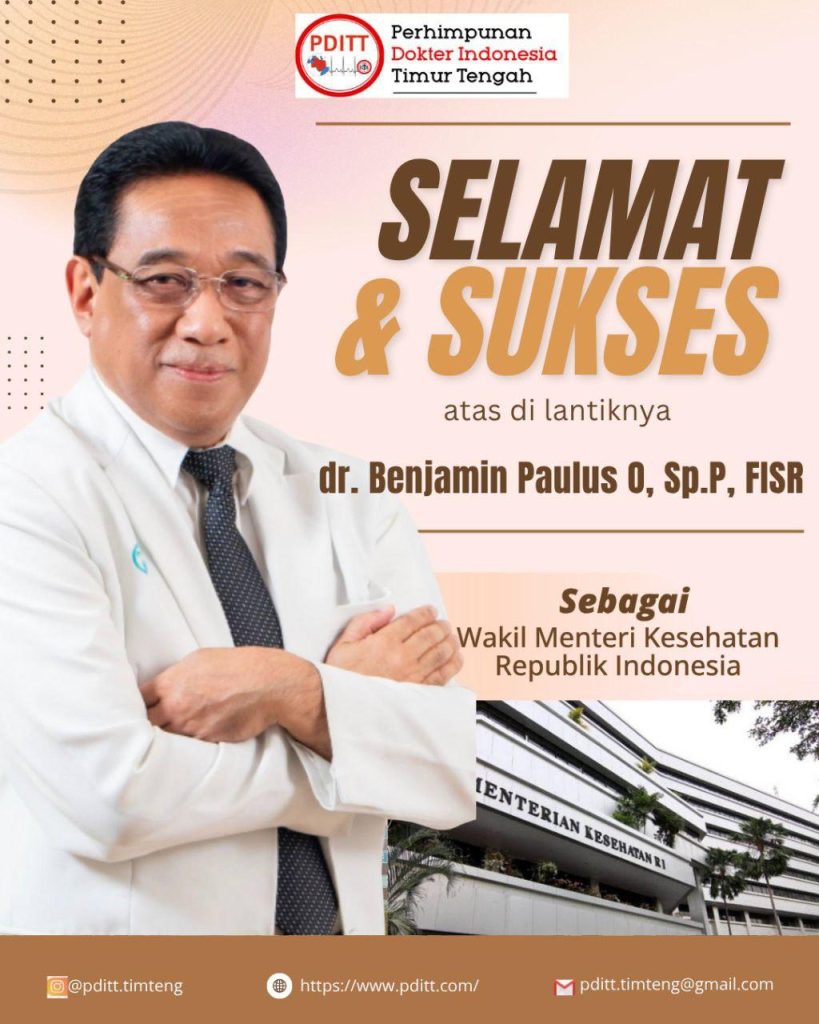 Kami dari Perhimpunan Dokter Indonesia Timur Tengah mengucapkan Selamat dan Sukses kepada Dr. Benjamin Paulus Oktavianus, Sp.P, FISR, atas dilantiknya menjadi Wakil Menteri Kesehatan Republik Indonesia Kabinet Merah Putih. Semoga senantiasa diberikan kesehatan, kekuatan, kebijaksanaan dan kemudahan dalam mengemban amanah untuk dunia kesehatan di Republik Indonesia yang semakin baik. aamiin.